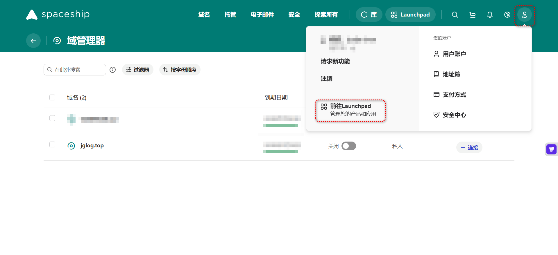 付款完成之后点击【Launchpad->域管理器】就可以看到刚购买的域名列表。