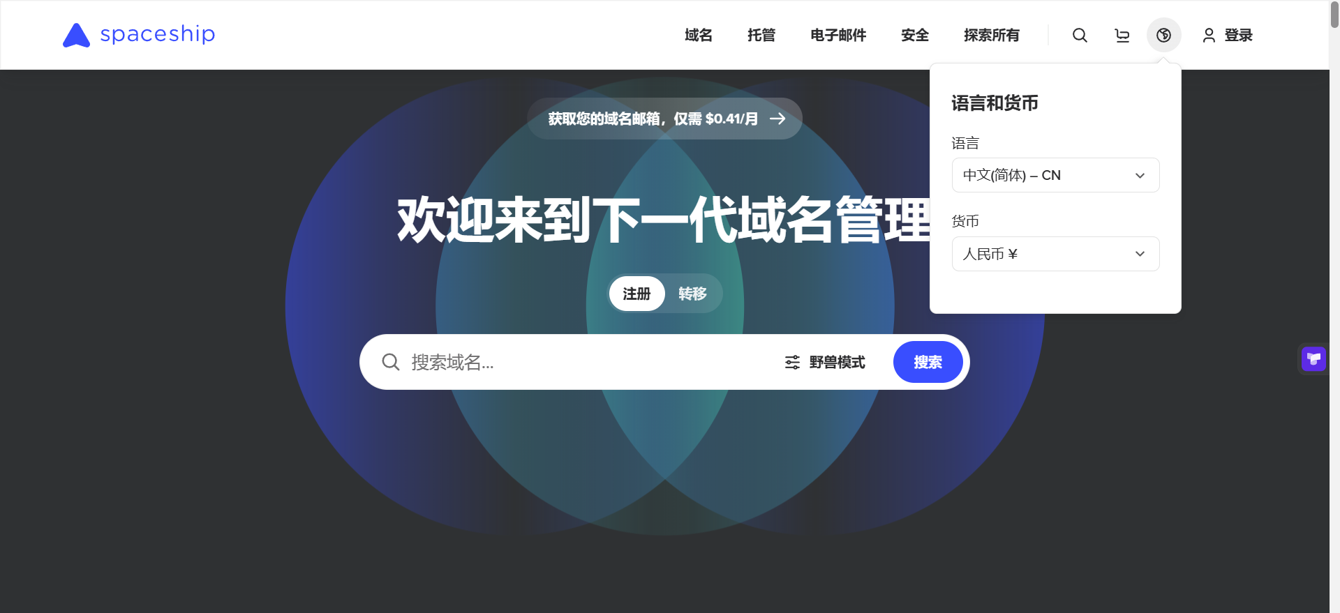 域名是在spaceship购买的,搜索框里面输入自己心仪的域名,确定好价格并且未被注册,就登录付款了,我是一次性买了2个域名,一个作为主域名,一个作为回源域名。英文不好的可以设置语言和货币,方便操作。